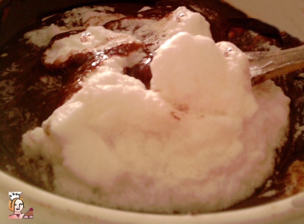 Deite numa tigela, os dois ovos inteiros, os outros 4 ovos separe a clara da gema, bata as claras em castelo, adicione as gemas aos dois ovos inteiros. Depois junte as 4 Cs de açúcar, reserve. Numa tigela, bata as gemas com as 7 Cs de açúcar até fazer um creme fofo e esbranquiçado. Adicione o licor de menta. Derreta a manteiga e o chocolate em banho maria, depois de arrefecer, junte ao preparado anterior. No fim, adicione e envolva as claras em castelo suavemente. Unte um pirex para ir ao forno com manteiga e polvilhe com chocolate em pó, verta a massa e polvilhe por cima também com chocolate em pó.